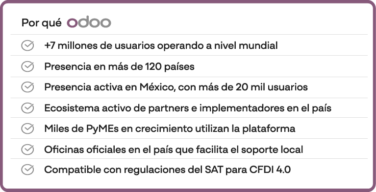 Un sistema de gestión empresarial utilizado por millones de empresas en el mundo y ampliamente adoptada en México por su flexibilidad, escalabilidad y modelo en la nube.